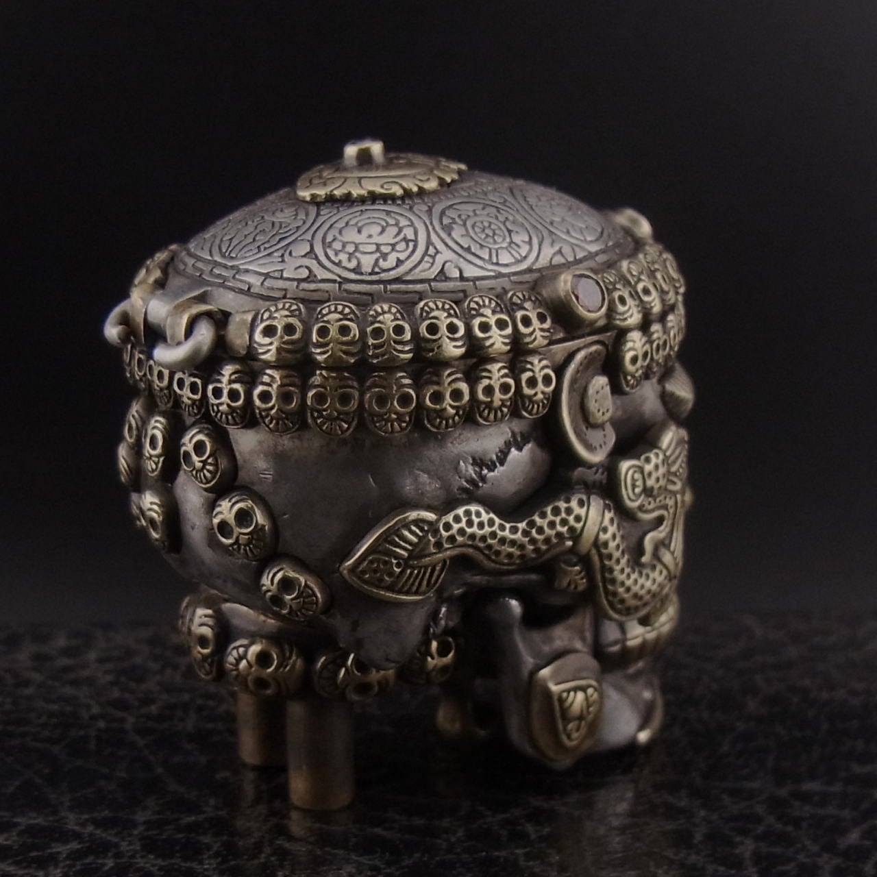 頭頂部は開閉式になっており、本物のチベタンスカルではこの頭頂部を儀式で盃(カパラ)として使用するそうです。